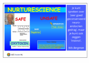 Die eenheid van zorggedrag en wetenschap heeft Nils Bergman gedoopt als ‘nurturescience’, de wetenschap rondom het effect van aan- of afwezigheid van beschermende zorg. In die context plaatst hij ook toxische stress: ‘sterke, langdurige activering van stresssystemen van het lichaam in afwezigheid van bufferende bescherming van volwassen ondersteuning’. Toxische stress is schadelijk voor het zich ontwikkelende brein en dus voor alle lichamelijke functies. Daarom is het belangrijk dat baby op de juiste plek is: het moederlichaam. Nils citeert bij herhaling een uitspraak van James McKenna: “Niets wat een baby wel of niet kan doen, betekent iets, tenzij bezien in het licht van moeders lichaam.” Als pasgeboren baby’s zich dáár bevinden, wordt duidelijk hoe ongelooflijk competent ze zijn en hoeveel heilzame wederkerigheid er zit in de moeder-kindinteractie.